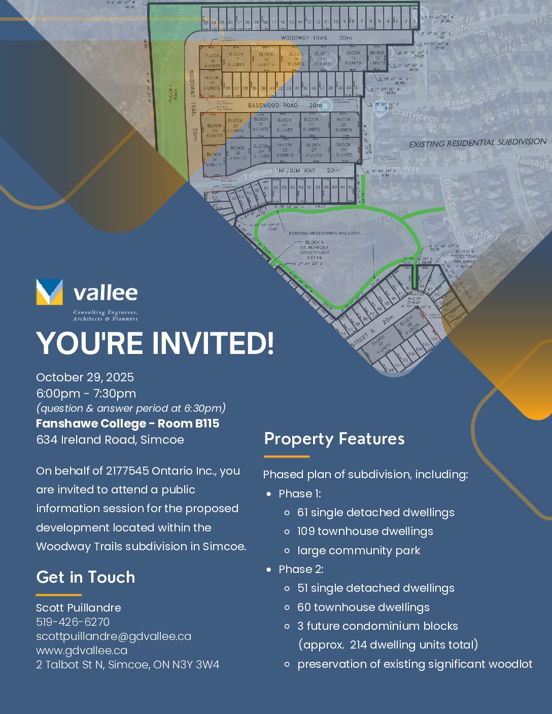 PUBLIC INFORMATION SESSION 2177545 Ontario Inc. is hosting a public information session for the proposed Woodway Trails subdivision in Simcoe. The session is scheduled for October 29, 2025, from 6:00 PM to 7:30 PM at Fanshawe College (Room B115) on 634 Ireland Road. A dedicated question and answer period will begin at 6:30 PM, offering community members an opportunity to engage directly with the project representatives. The proposed development is a large, phased plan that includes a significant number of new dwellings and community features. Phase 1 consists of 61 single detached homes, 109 townhouses, and a large community park. Phase 2 will add another 51 single detached homes, 60 townhouses, and three future condominium blocks totaling approximately 214 units. A key feature of the plan is the preservation of an existing significant woodlot. For further information, the public can contact Scott Puillandre at the provided details.
